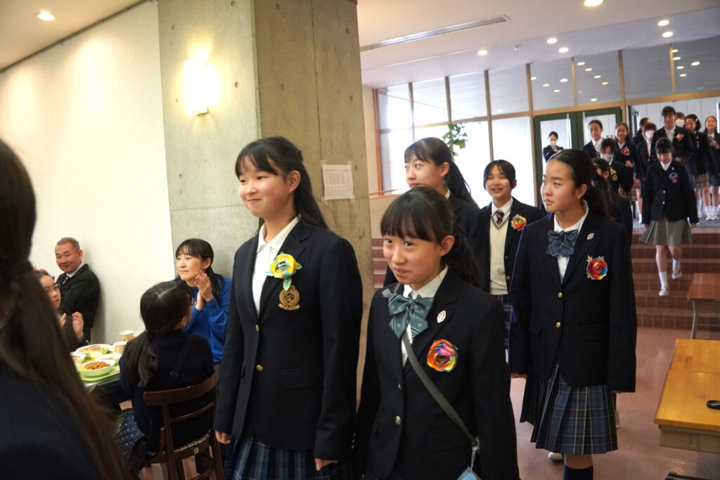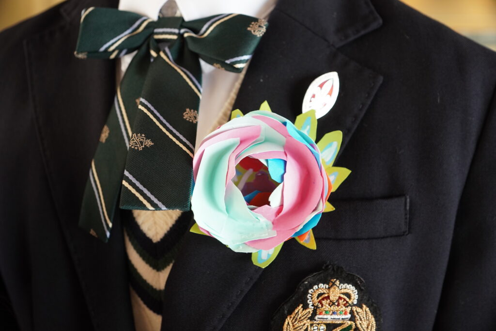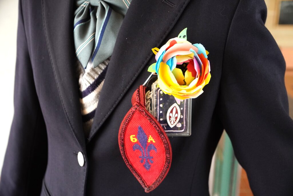 1年生がお姉さんのためにつくった、手作りのお花が、6年生の胸元を明るく華やかにしています。
