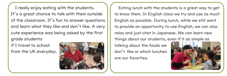「こっちこっち!」「一緒に食べたい!」と、食堂で弾む声がよく聞こえてきます。英語のネイティブ講師に嬉しそうに(時に必死に)声をかけ、テーブルにもう一人分のスペースをササっと空けてくれる子どもたち。本校は教員も全校児童と一緒に食堂で給食をいただきます。英語の講師も一緒に給食や祝会のお食事をいただいています。食卓を囲む中で、普段の英語の授業とはまた少し違った会話をお互いに楽しんでいるようです。