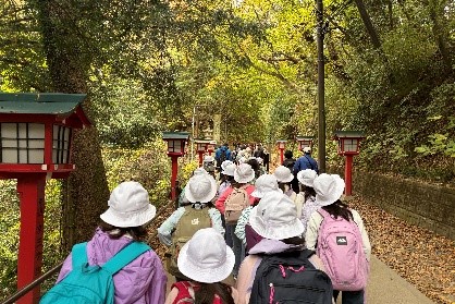 秋が深まり紅葉が美しい季節、3年生は高尾山に行きました。吉祥寺駅に集合し、電車では程よい緊張感をもって、周りに気をくばりながら行くことができました。高尾山口駅に着くと、空気が変わったのを感じました。「山の香りがする!」そんな声も聞こえてきました。